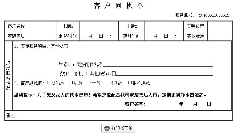 上图中被加粗字体的信息保存后将会自动引用到《派工服务单》上,如下图多联派工单样式中的:公司名称、服务热线、投诉电话和公司地址信息都是上图页面中的内容。如何科学规范派工服务?请查看“派工流程管理”帮助文章。