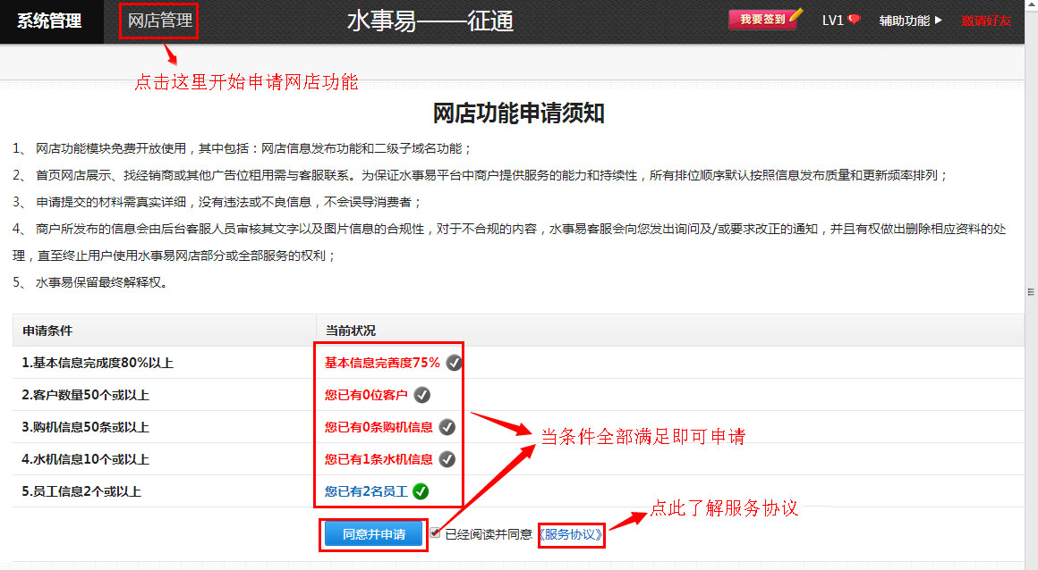 为了方便经销商的推广,水事易提供免费网店管理功能,符合简单条件即可申请开通使用,开通网店可以获取更多推广机会哦,如果经销商需要发布产品,可以通过此功能实现,使用户找经销商更便捷、更迅速,下面介绍一下申请使用网店的步骤。