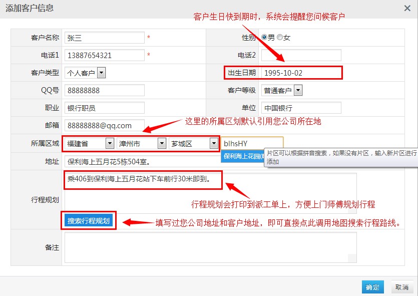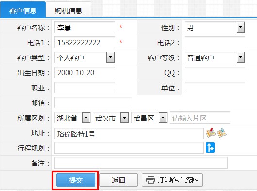 第二步:按照下图示例填写客户相关信息,并确定提交后即可保存: