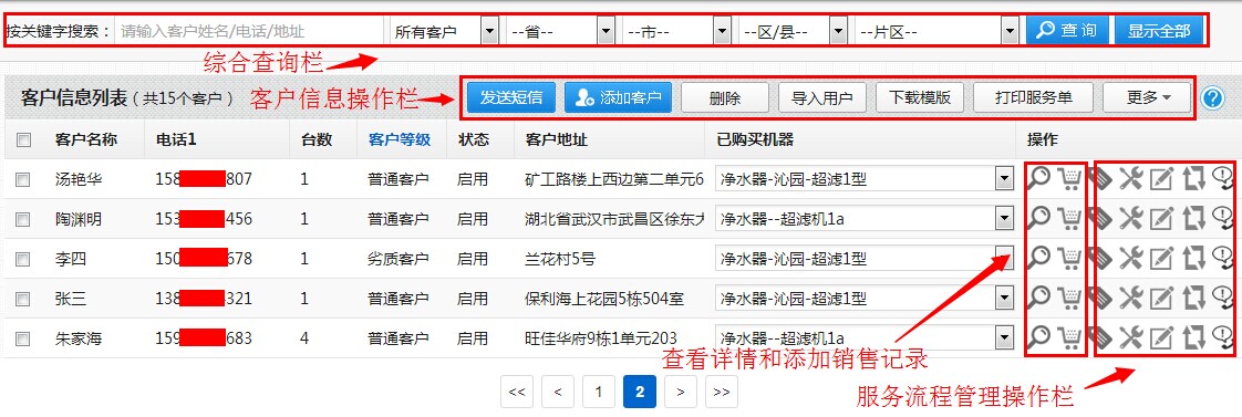 水事易系统提供按关键字和用户的行政区划和片区综合条件查询用户功能,方便经销商精确定位查找用户。