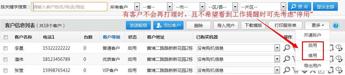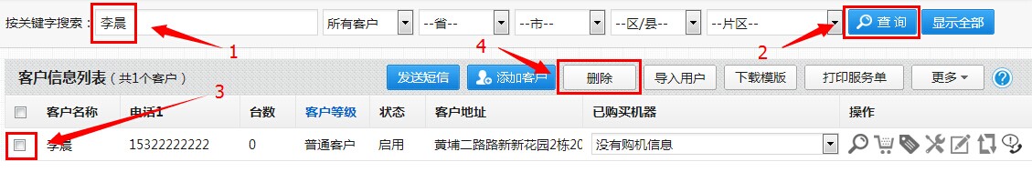 需要注意的是:客户信息删除时会连带此客户的购机信息和服务记录等相关资料一并删除,且不便于恢复,需谨慎操作!