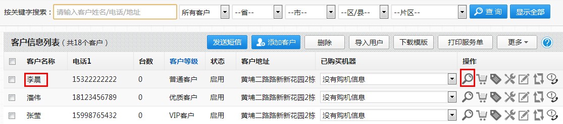 第一步:找到要修改的客户资料,点击“操作栏的放大镜——“查看详情”按钮,比如按下图查看修改李晨的客户资料: