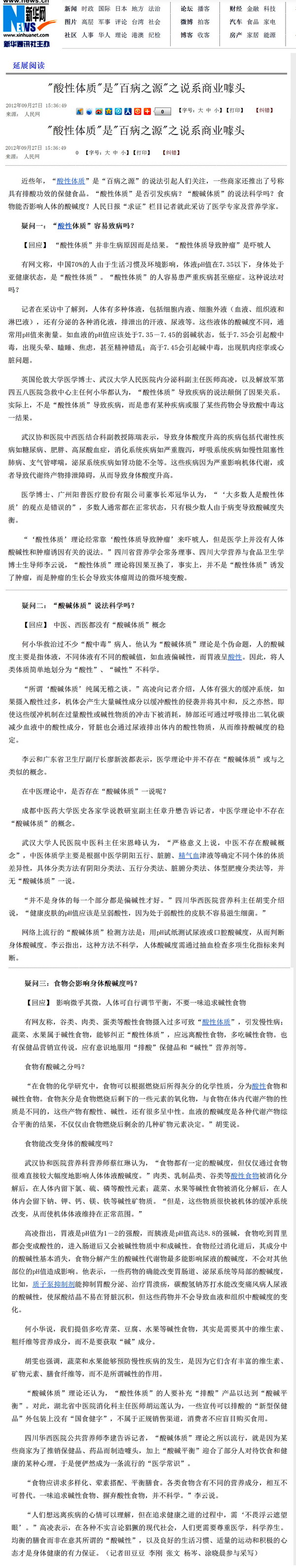 剪报图片:新华网 酸性体质是百病之源之说系商业噱头