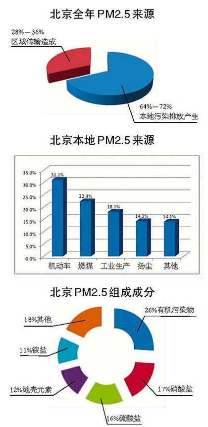 近日,北京市环保局局长陈添介绍了北京大气细颗粒物(PM2.5)来源的最新解析结果。通过模型解析,北京全年PM2.5来源中,区域传输约占28%—36%,本地污染排放占64%—72%。而在本地污染源中,机动车占比高达30%以上。